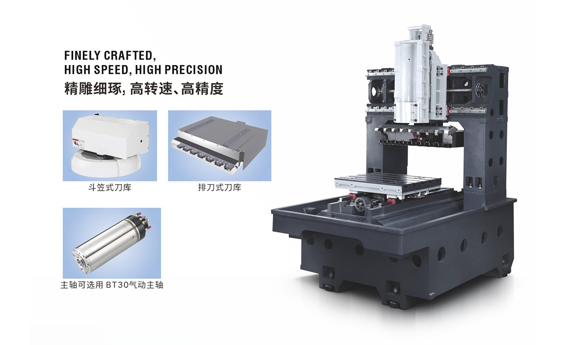 龙门式结构,加大底座和立柱,稳定可靠。 搭配高速高精度主轴,加工精度高,光洁度好。 配备主轴油冷机,确保主轴热量不会损失主轴特性。 三轴采用线性导轨,速度快,精度高。 集雕刻、雕铢加工为一体的多功能雕铳机床。 适用于较小铢削量,小型模具的精加工,如铜件、石墨等的加工。产品应用